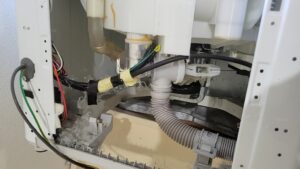 洗濯機内部を確認すると排水排水弁や排水弁モーターなど不具合はなく、排水経路に異物などが詰まっている可能性があります。