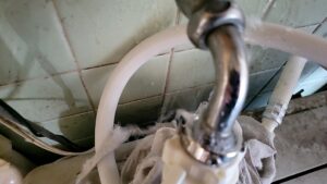 試運転にて点検すると洗濯機を給水と給水停止をする度に洗濯機の給水ホースに繋いでる水栓の先から水漏れを起こしていました。