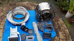 ドラム式洗濯機本体からステンレスドラムや乾燥ダクトなどを分解して取り外しました。