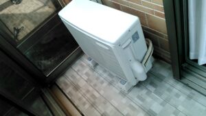 室外機もエアコン室内機を設置するお部屋の真裏でベランダの平地置きの為、標準工事内で工事が出来ます。