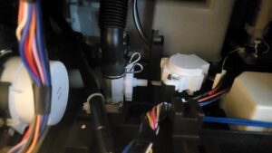 分解した部品を元に戻して洗濯機に水を給水して、脱水運転で排水の状態を確認しました。